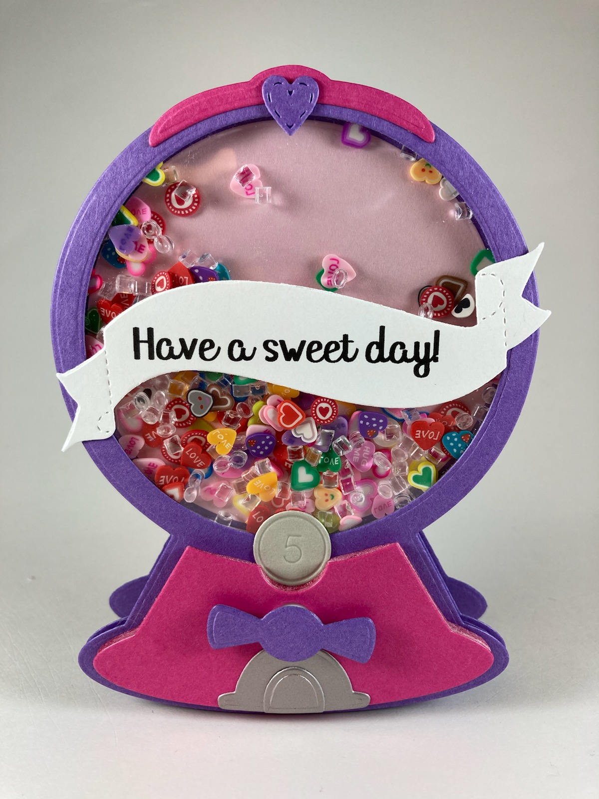 Gumball shown here as a free standing card. We used a slide guide to make the knob spin. This gum ball machine is filled with conversation hearts and sugar confetti. This card accented with the Wavey Banner Die and the I chews you stamp.